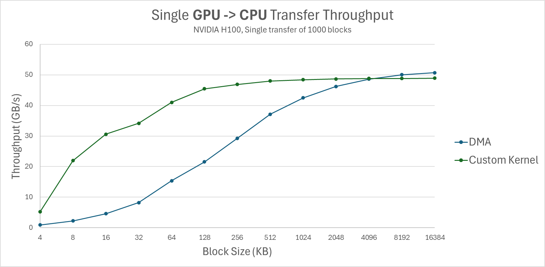 Figure 3: Single GPU -> CPU transfer throughput (NVIDIA H100, Single transfer of 1000 blocks).